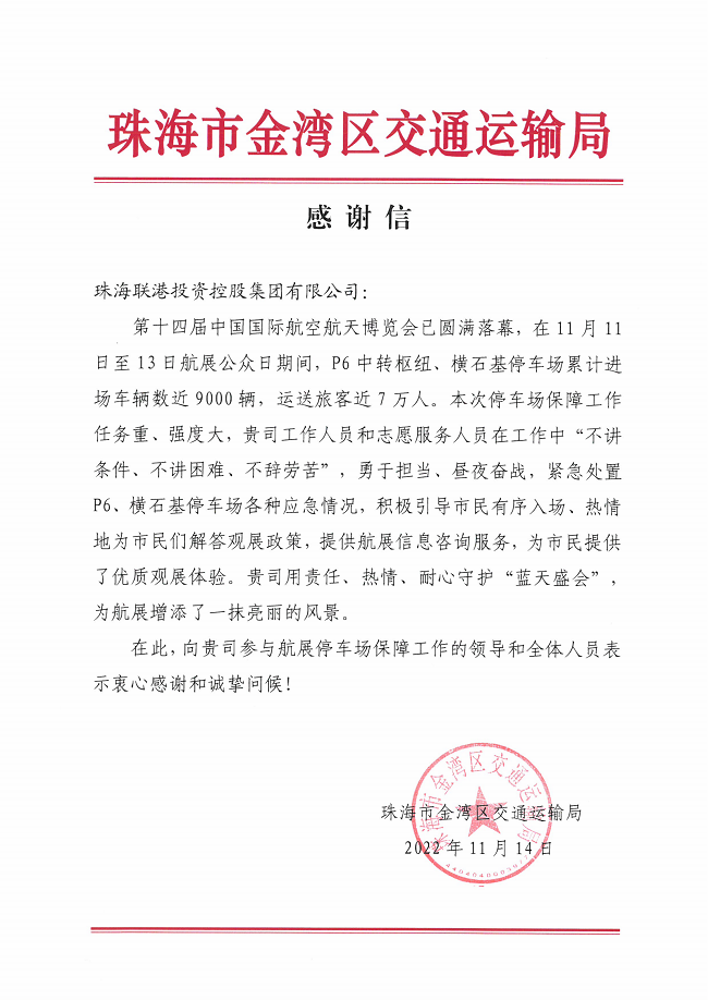 珠海市金灣區(qū)交通運(yùn)輸局向聯(lián)港集團(tuán)參與航展停車場(chǎng)保障工作的領(lǐng)導(dǎo)和全體人員表示衷心感謝和誠(chéng)摯問候!