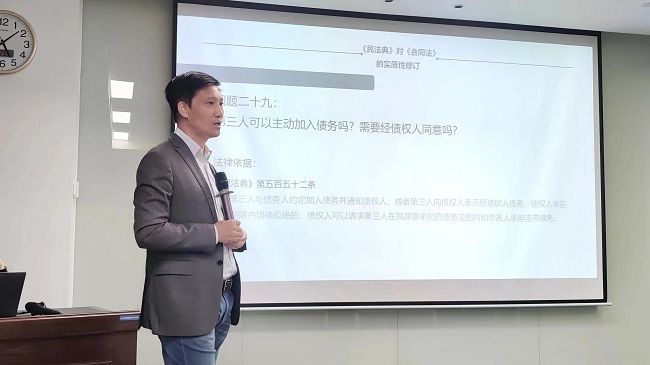 北京大成(珠海)律師事務(wù)所高級合伙人薛鵬律師以《民法典下合同實務(wù)研究》為主題貫穿培訓課程,通過三十個常見的實務(wù)案例問題,詳細解讀了《民法典》對合同編作出的實質(zhì)性修改內(nèi)容,進一步強調(diào)合同訂立、履行、變更、解除等管理工作重要性。參訓人員積極互動交流,提出實操過程中合同履約、風險控制等方面的疑問,切實化解工作中的難題。